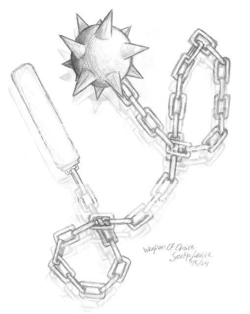 - Description: I was bored at work today and drew this... forgot my homework. ^_^ I guess I was just inspired from watching Kill Bill and needed to vent. I'm a big fan of medievil weaponry, with swords being my favorite of course, but decided to go with something different. Got the idea from Gogo Yubari's weapon, except this one has a mace head. I have yet to do one of Uma Thurman's character. But anyway! This one was done in pencil, and the only editing I did was with the clone stamp tool to make the reflect