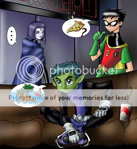 - Description: A silly pic I slapped together. I focused on BB first, so the bg is sloppy. Raven and Robin, also quickies, are heading out for pizza, but BB wants to stay at home to watch Gilligan's Island. >.>; More fanart at my site: http://www.emisan.deviantart.com